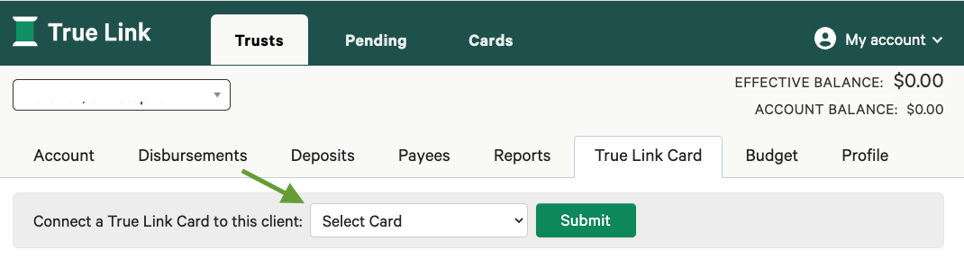 - Your beneficiary’s True Link Visa® Prepaid Card will now be listed as a disbursement option on the “Disbursements” tab.